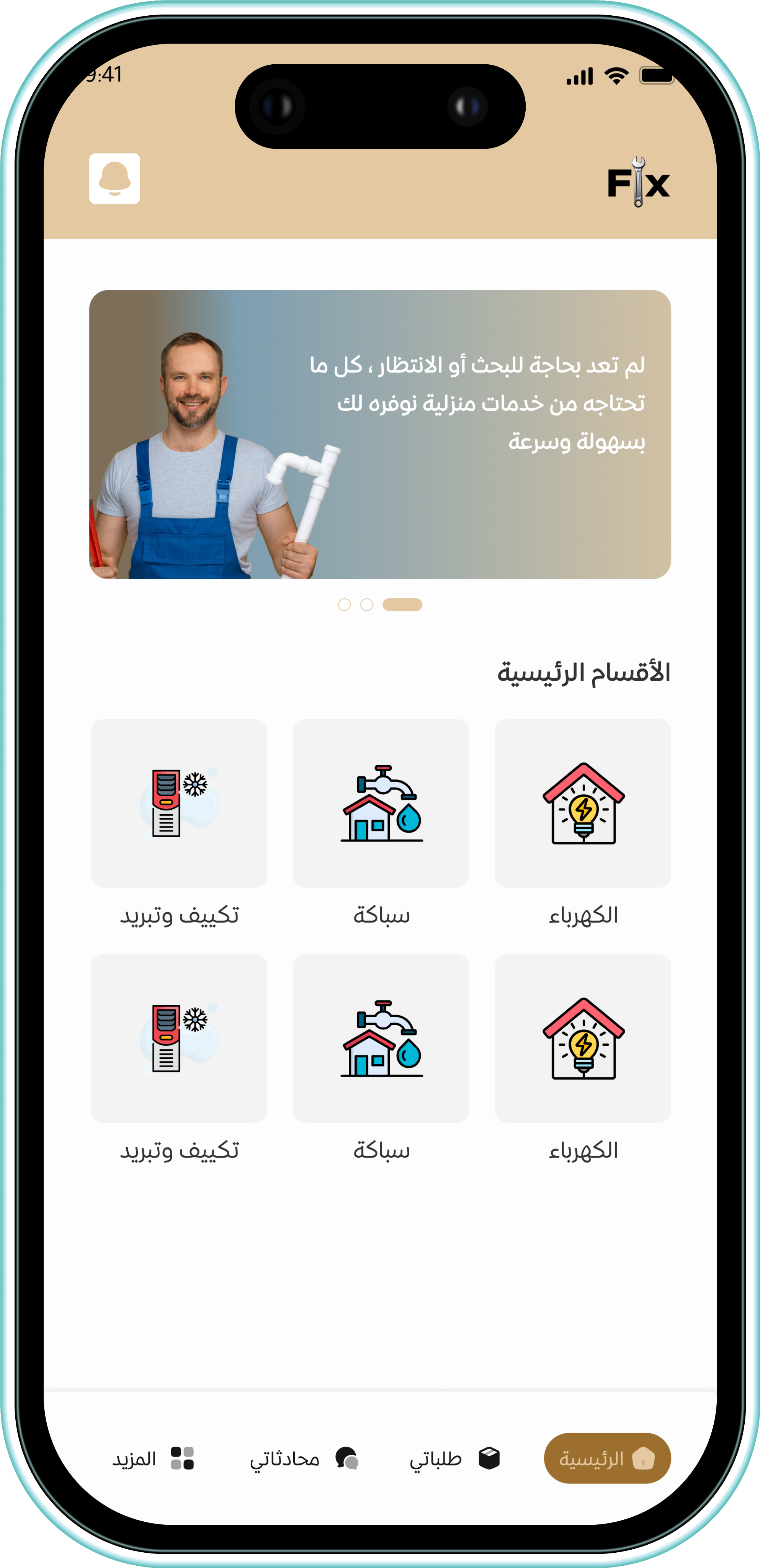 "FIX" هو تطبيق شامل يقدّم منصة ذكية تربط العملاء بمقدمي خدمات الصيانة المنزلية المؤهلين، مثل السباكين، الكهربائيين، عمال الدهانات، صيانات الأجهزة، النجّارين، وغيرهم كما يهدف التطبيق إلى تسهيل عملية البحث والحجز من خلال واجهة سهلة الاستخدام، مع توفير تقييمات ومراجعات صادقة تساعد العملاء على اختيار الأنسب لهم.